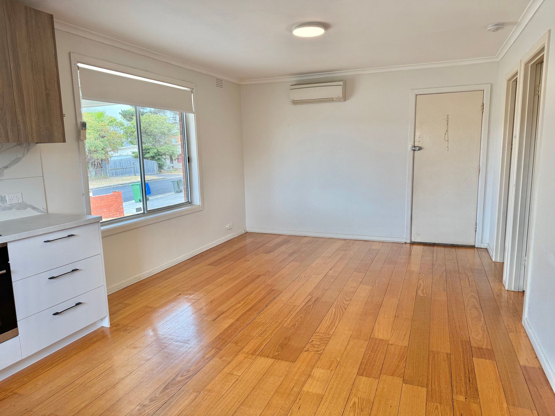 The property offers modern living with a modern kitchen with electric cooking and a recently renovated bathroom including laundry facility, and gleaming polished floorboards.