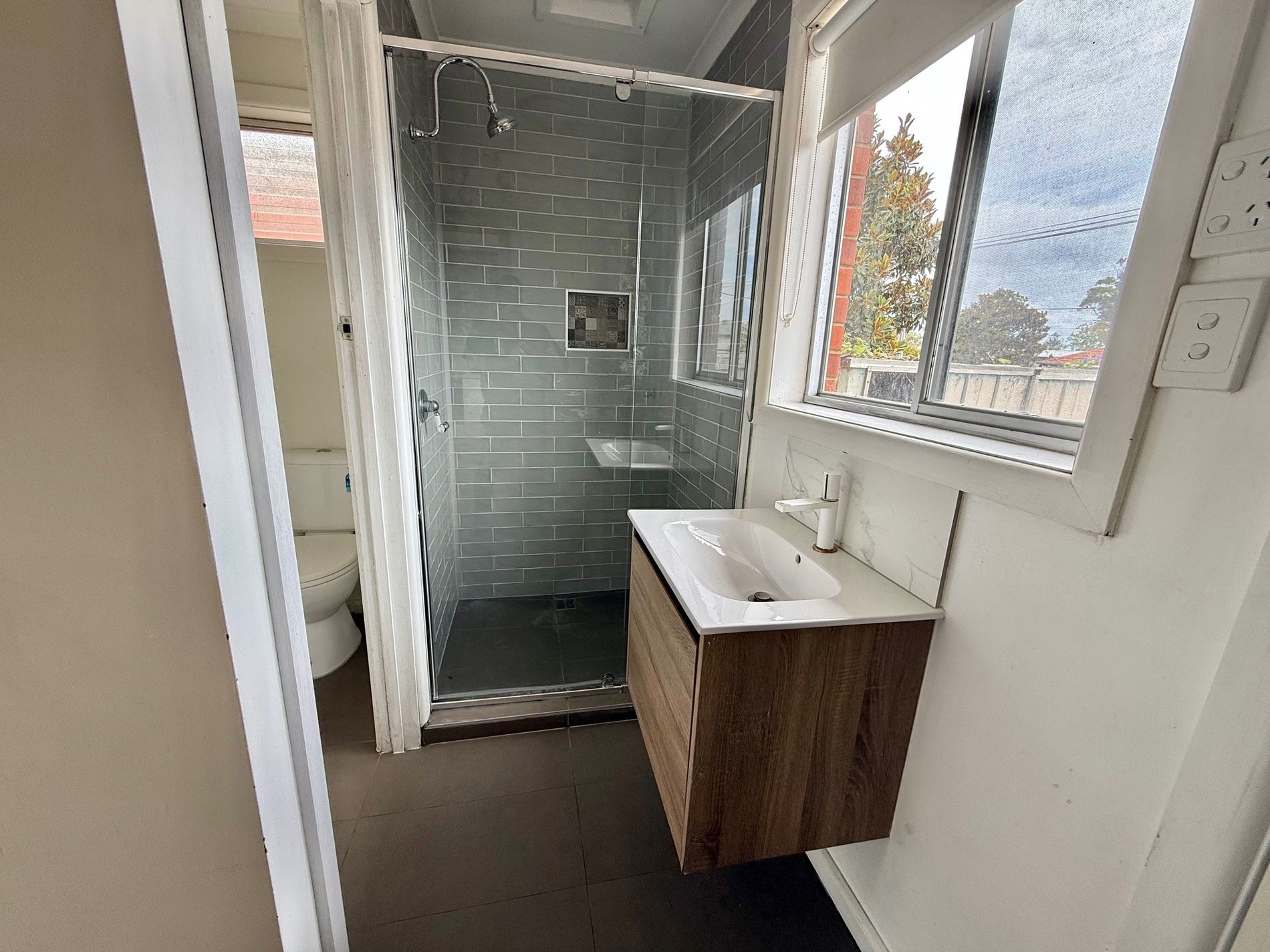 - Renovated bathroom with neutral tones and laundry facility